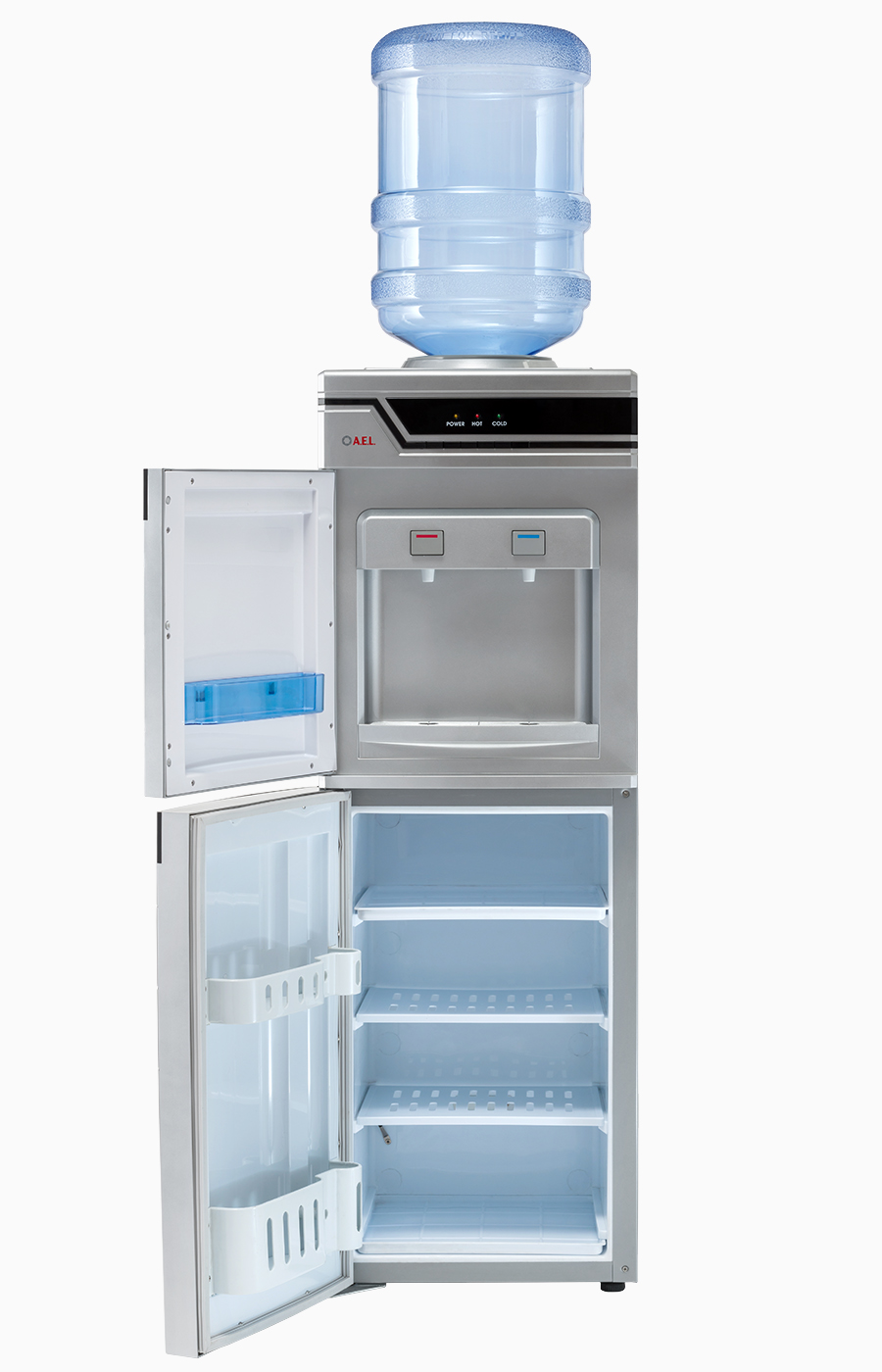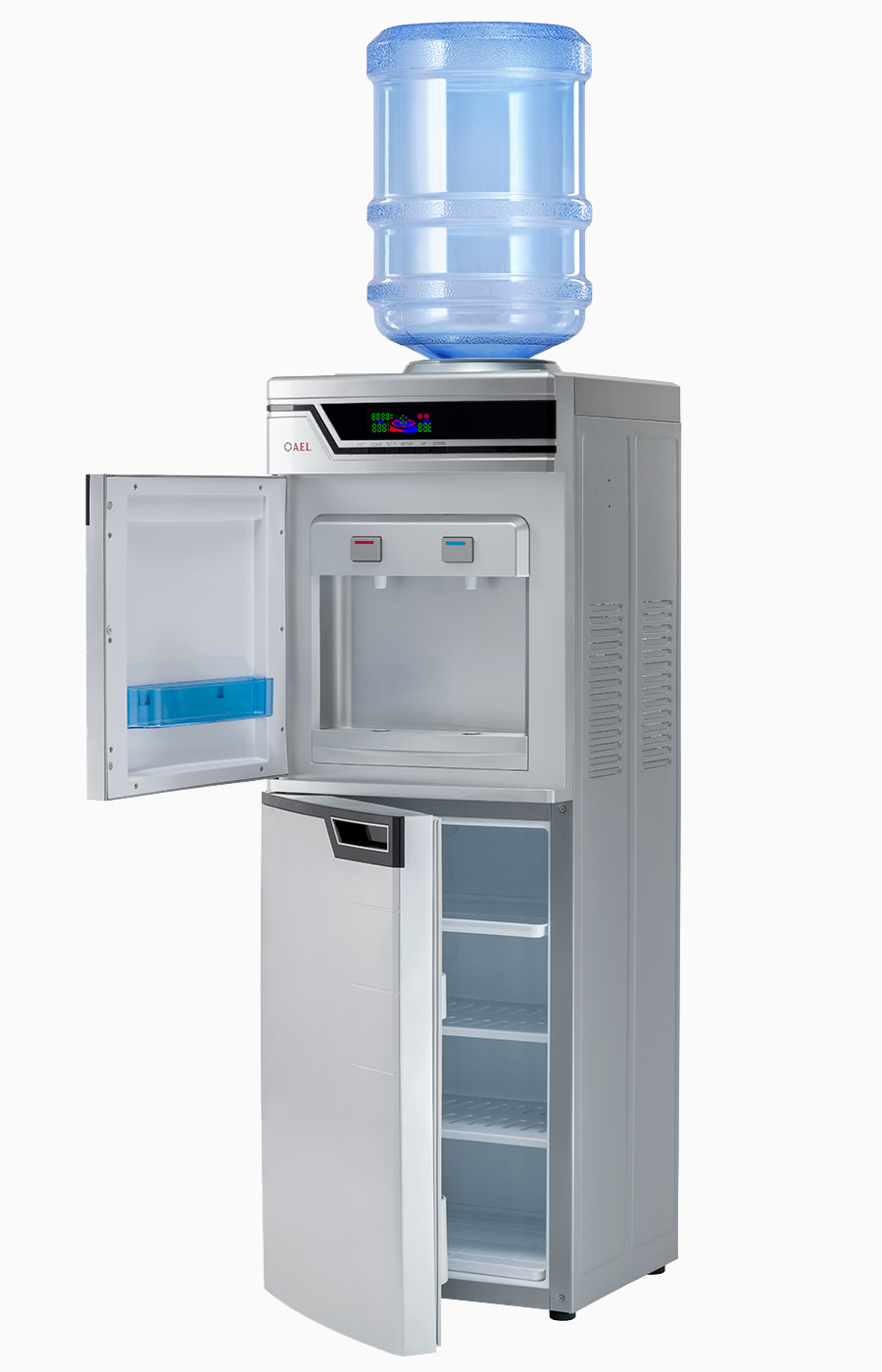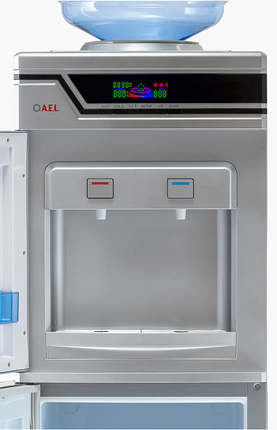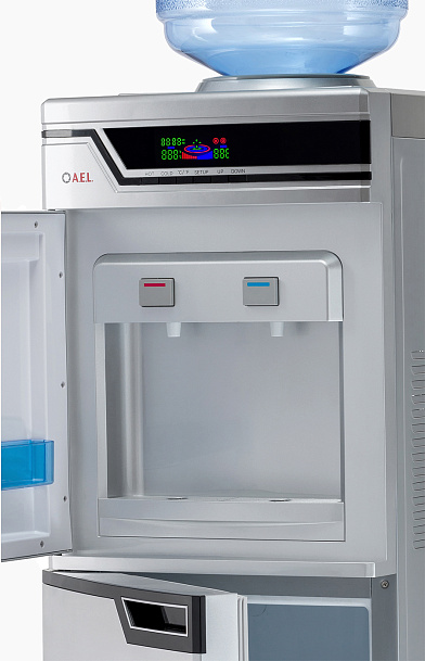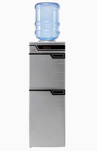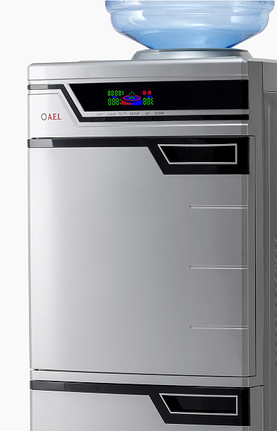 Высокая презентабельная модель серебристого цвета – удобное решение для установки в большом офисе. Кулер оснащен вместительной 50-литровой холодильной камерой для хранения продуктов. Модель высокопроизводительная: за один час можно получить 5 литров горячей и 2 литра холодной воды. Встроенный дисплей отображает все параметры работы устройства. Краны-клавиши закрыты дверцей.