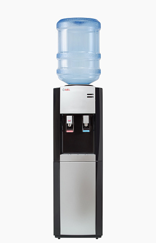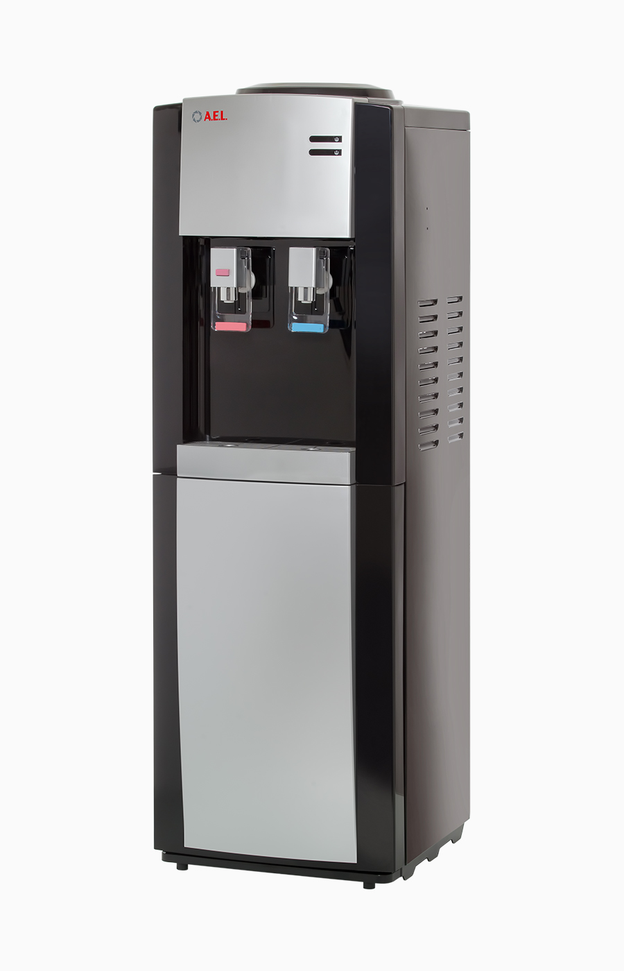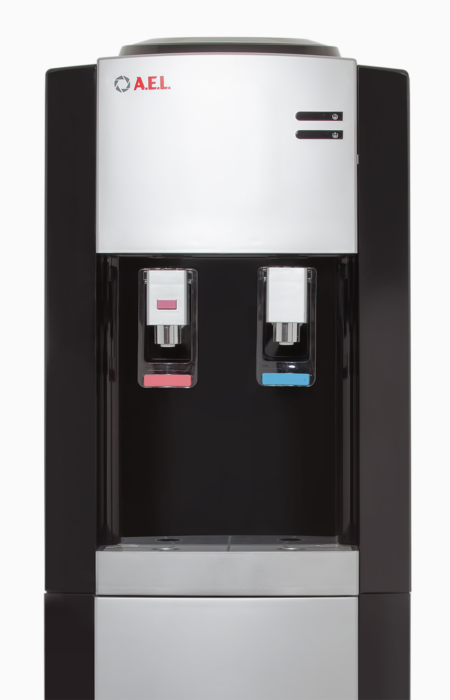 Новинка. Напольный кулер с компрессорным охлаждением черного цвета с сереберистой вставкой на лицевой панели и лотком. Верхняя загрузка бутыли. Удобные краники "нажим кружкой" с внутренней резьбой, которые при необходимости легко и быстро заменить. Кран горячей воды оснащен кнопкой-защитой от случайного нажатия.