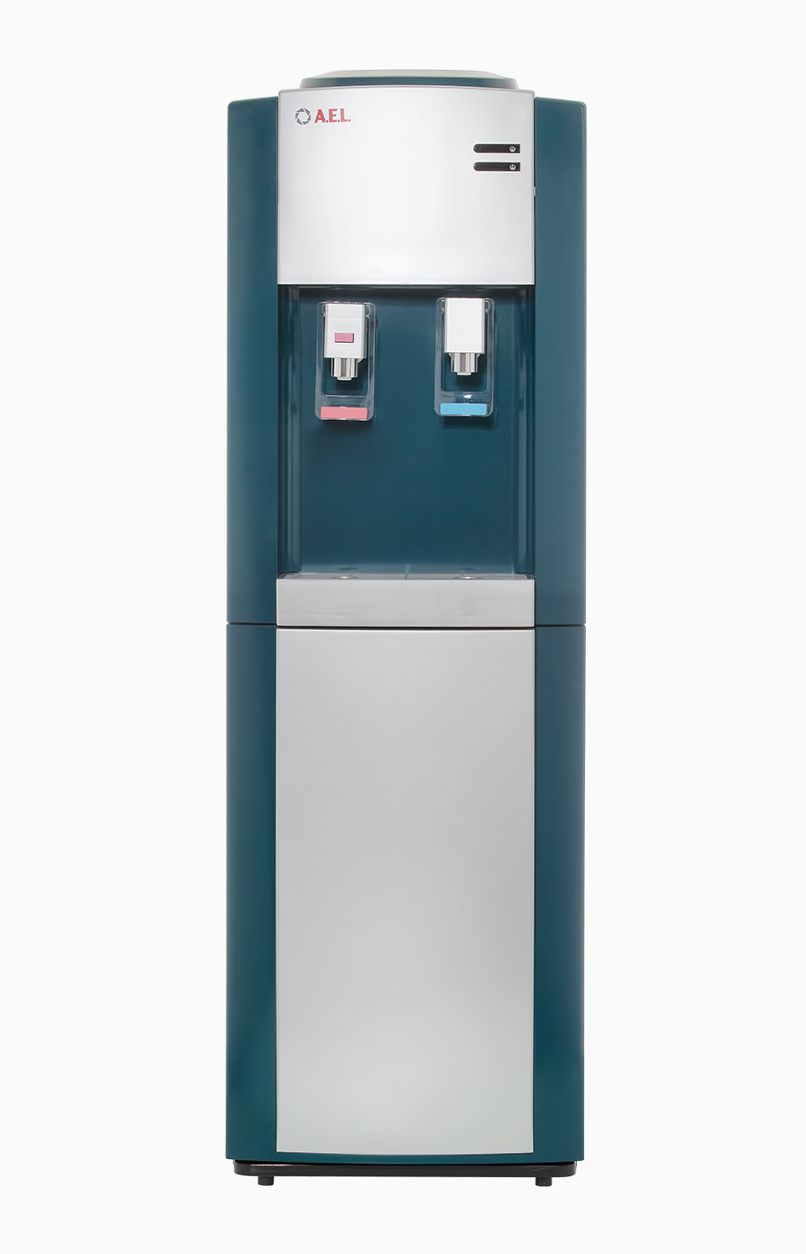 Новинка. Напольный кулер с компрессорным охлаждением цвета маренго с сереберистой вставкой на лицевой панели и лотком. Верхняя загрузка бутыли. Удобные краники "нажим кружкой" с внутренней резьбой, которые при необходимости легко и быстро заменить. Кран горячей воды оснащен кнопкой-защитой от случайного нажатия.