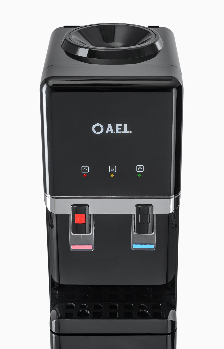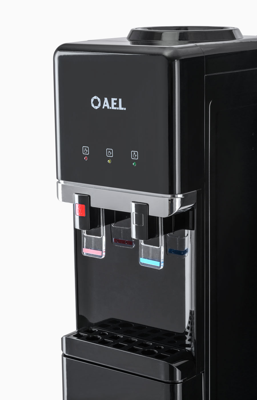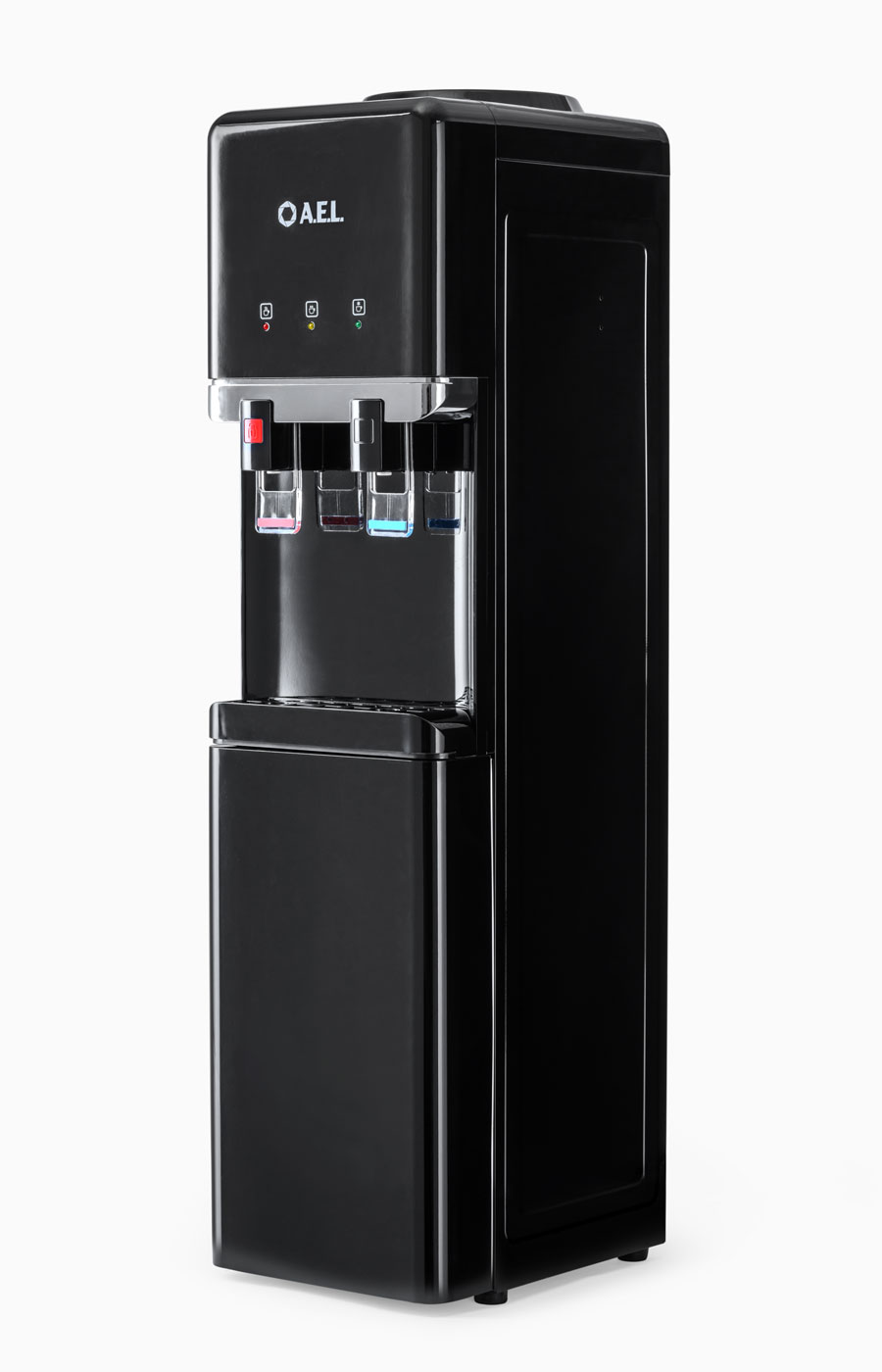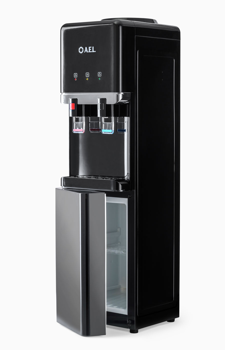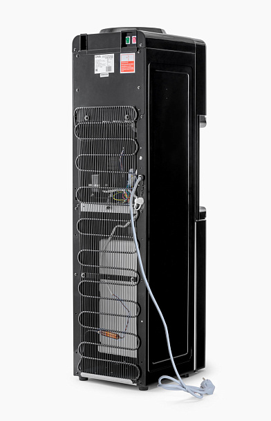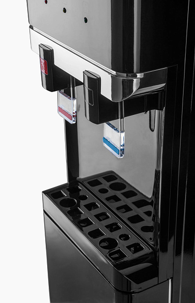 Новинка - напольный кулер с компрессорным охлаждением черного цвета с металлической вставкой. Верхняя загрузка бутыли, шкафчик 11л для хранения чая, кофе, стаканчиков и т.п. Удобные краники "нажим кружкой". Кран горячей воды с кнопкой-защитой от случайного нажатия. Широкий лоток для сбора капель.