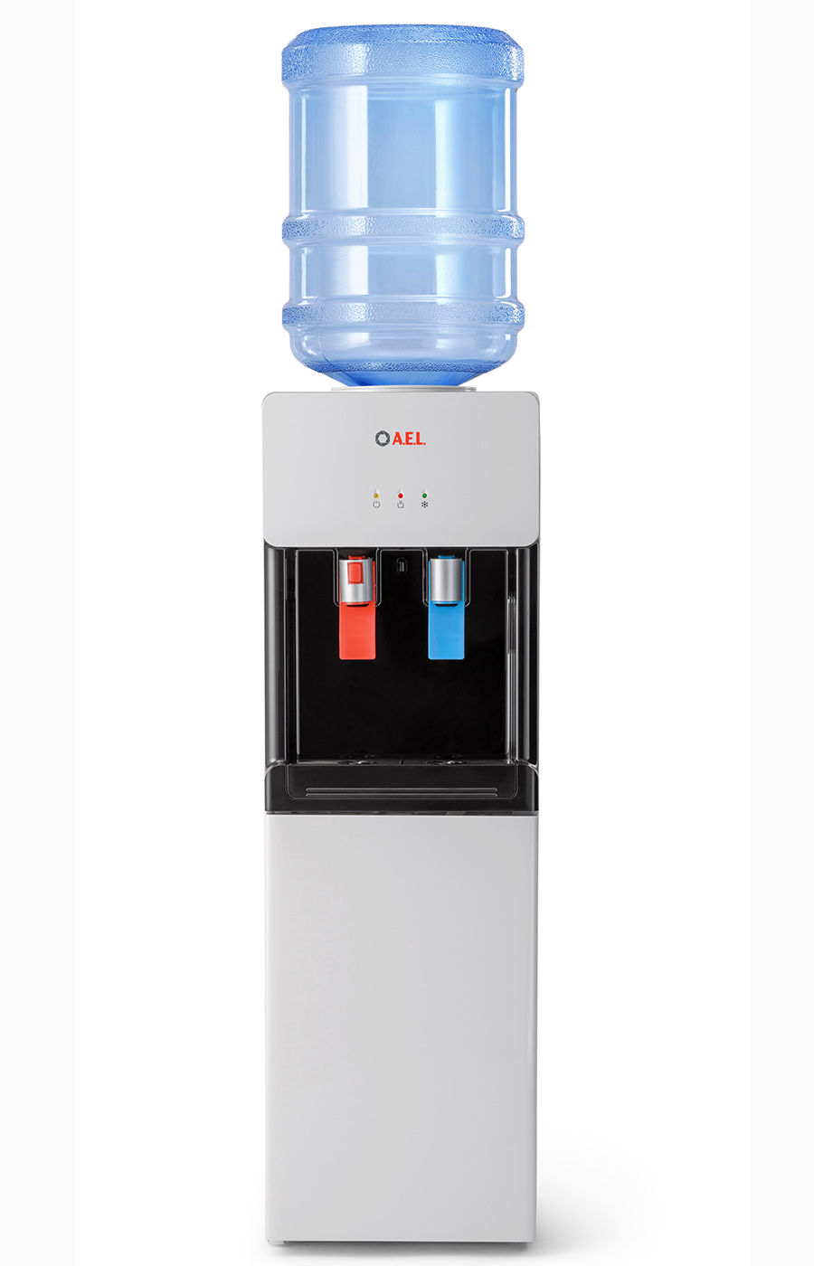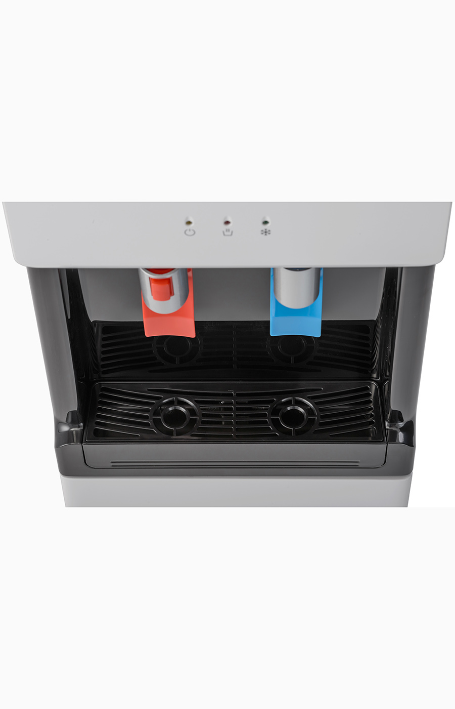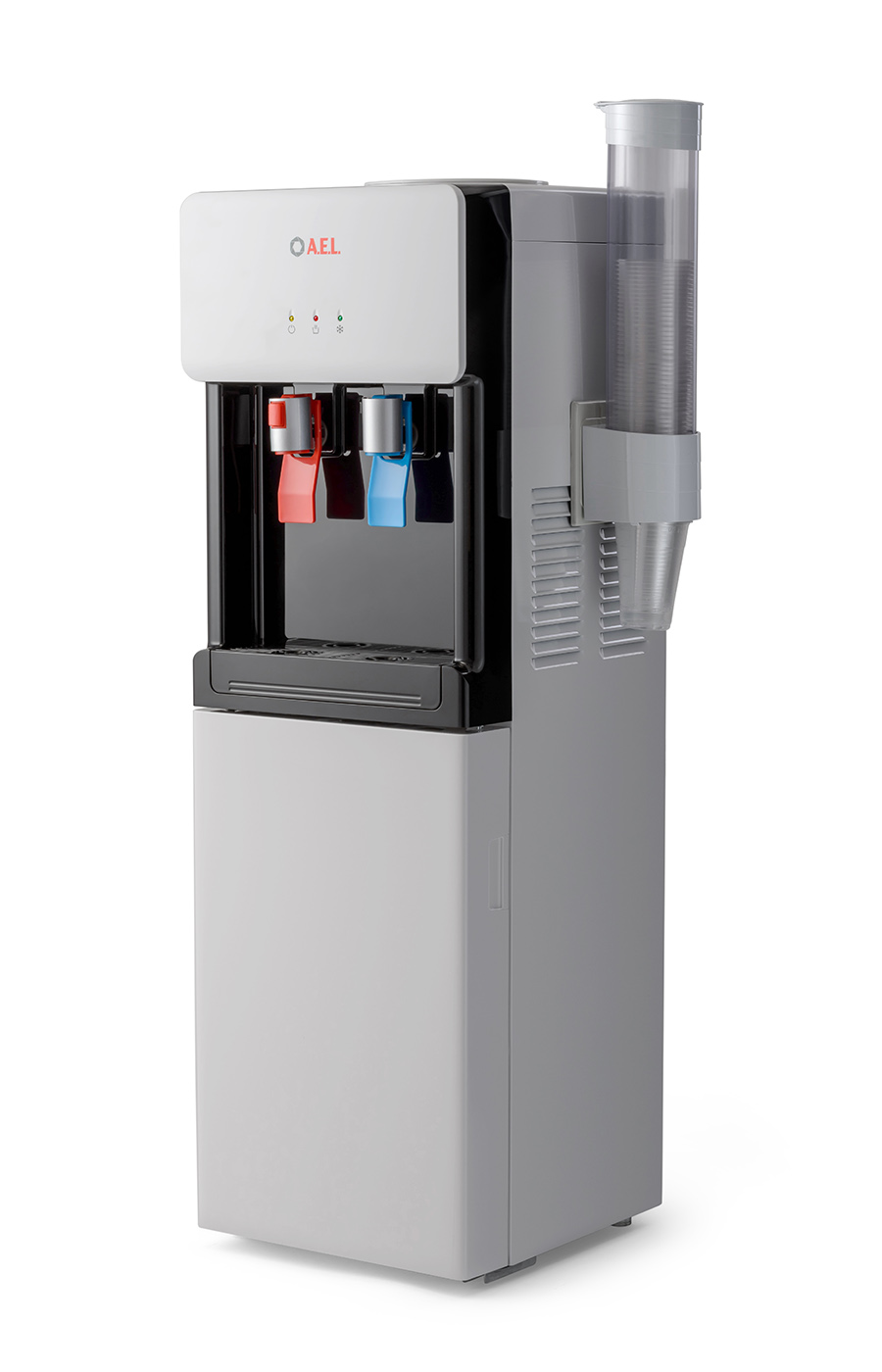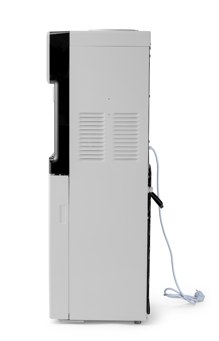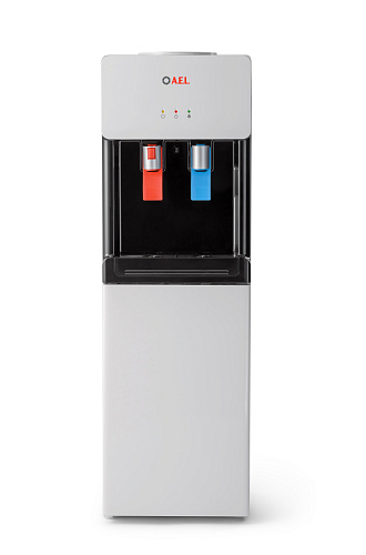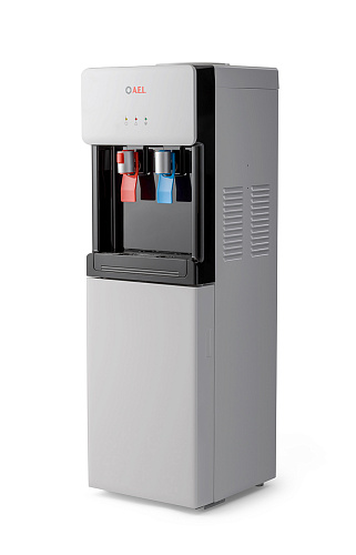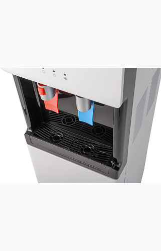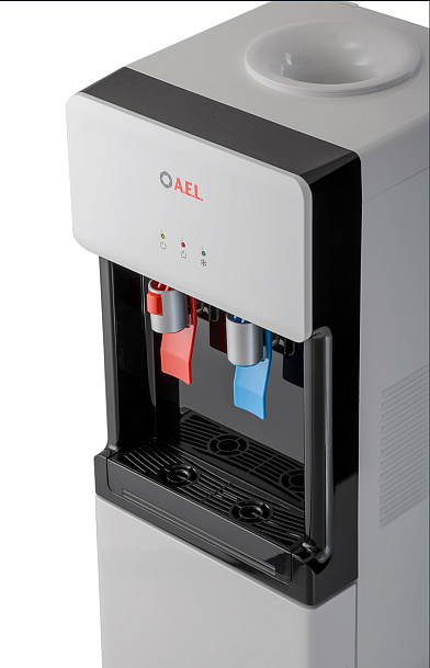Компрессорный кулер с верхней загрузкой бутыли. Основные части выполнены из пластика, а боковые стенки из металла, что позволяет прикрепить держатель для стаканов на магните. На боковых стенках имеются технические отверстия и для крепления держателей на шурупах. Длинные удобные PUSH-краны с защитой от случайного нажатия на горячем кране. Широкий лоток для сбора капель.