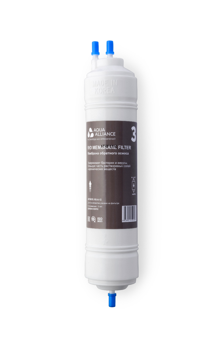 RO Membrane filter Aquaalliance. Мембрана обратного осмоса. Размер 12". Производительность 80GPD (~300л./сутки). Замена каждые 24-36мес. Имеет выходы для быстрого соединения типа цанга-цанга. Страна производства Корея.