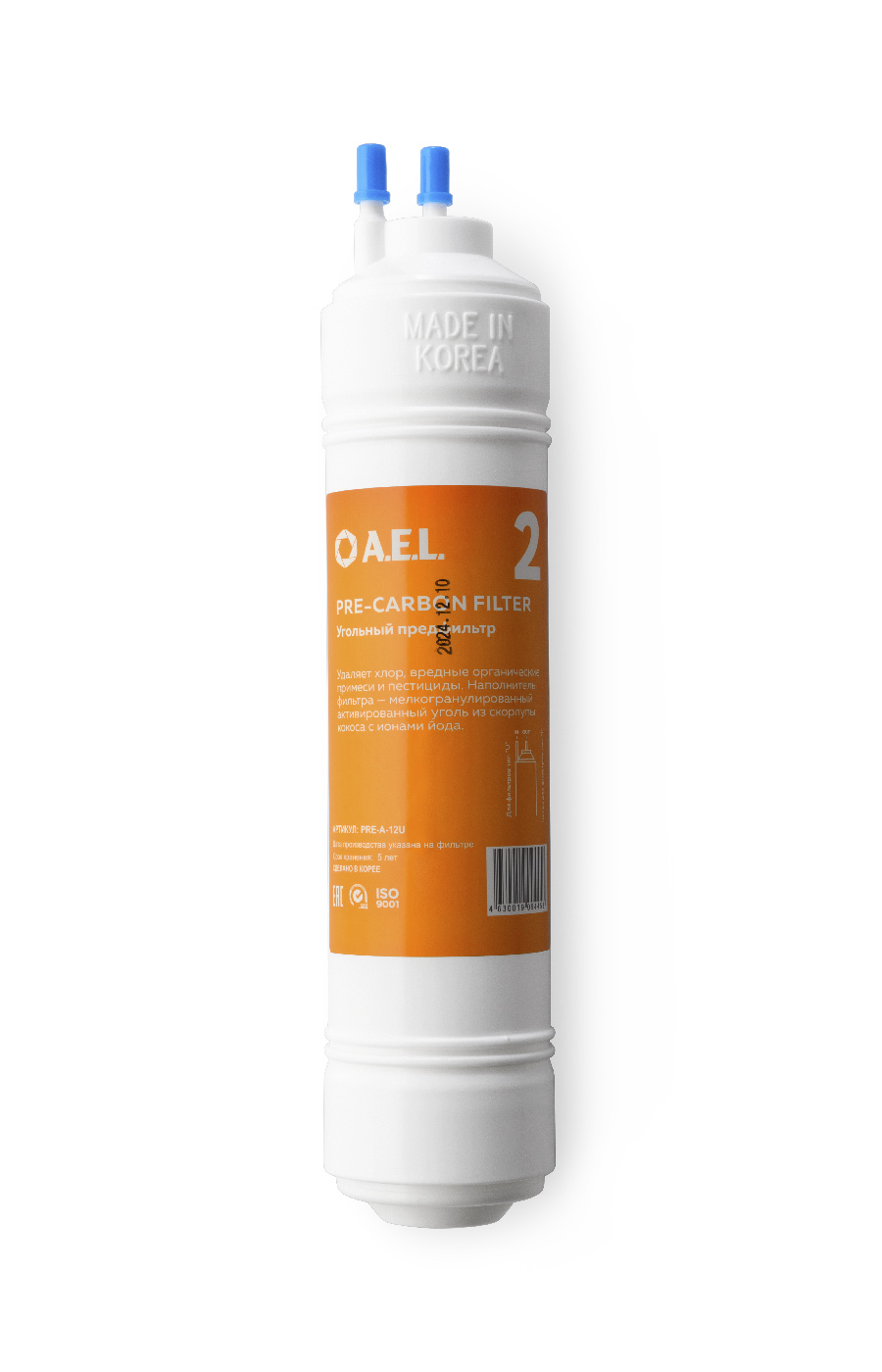 Угольный предфильтр тм AEL (№2). Наполнитель фильтра - мелкогранулированный активированный уголь из скорлупы кокоса с ионами йода. Удаляет хлор, вредные органические примеси и пестициды. Размер 12", тип U.