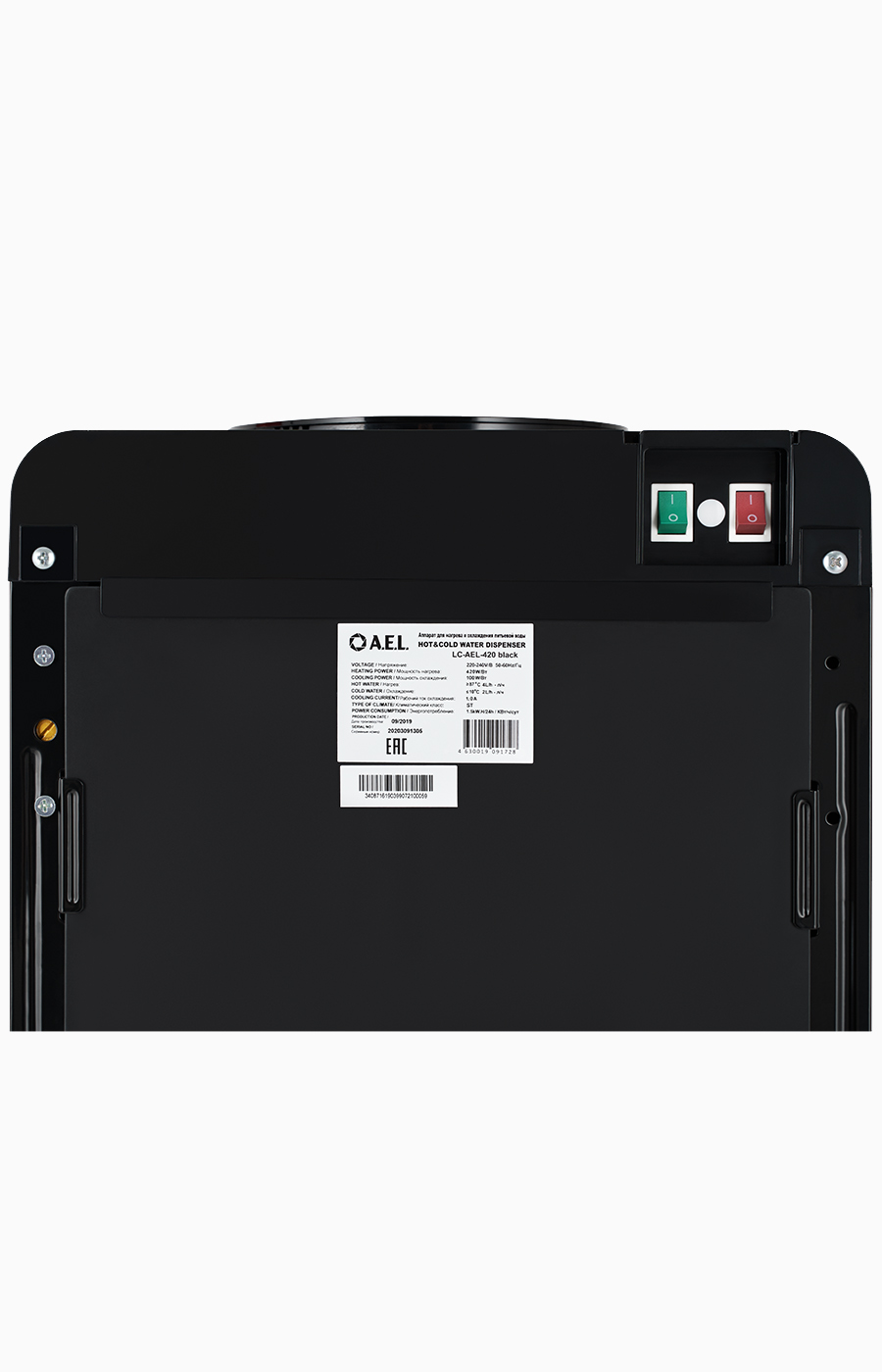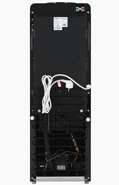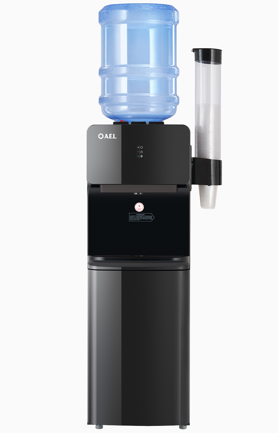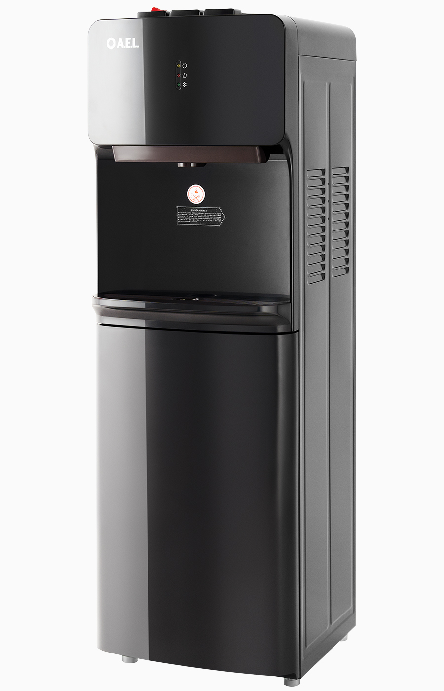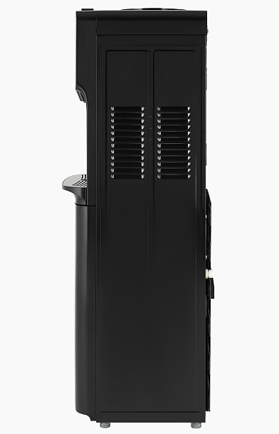 Напольный кулер с верхней загрузкой бутыли с компрессорным охлаждением черного цвета, глянцевый. Высота кулера 930мм позволяет комфортно нажимать на три клавиши, одна из которых - горячей воды - имеет защиту от случайного нажатия. Цвет: черный глянец.