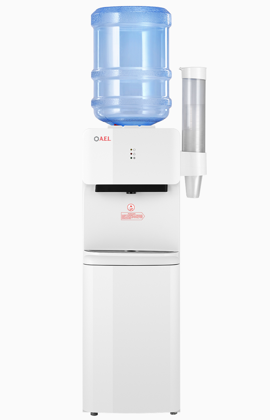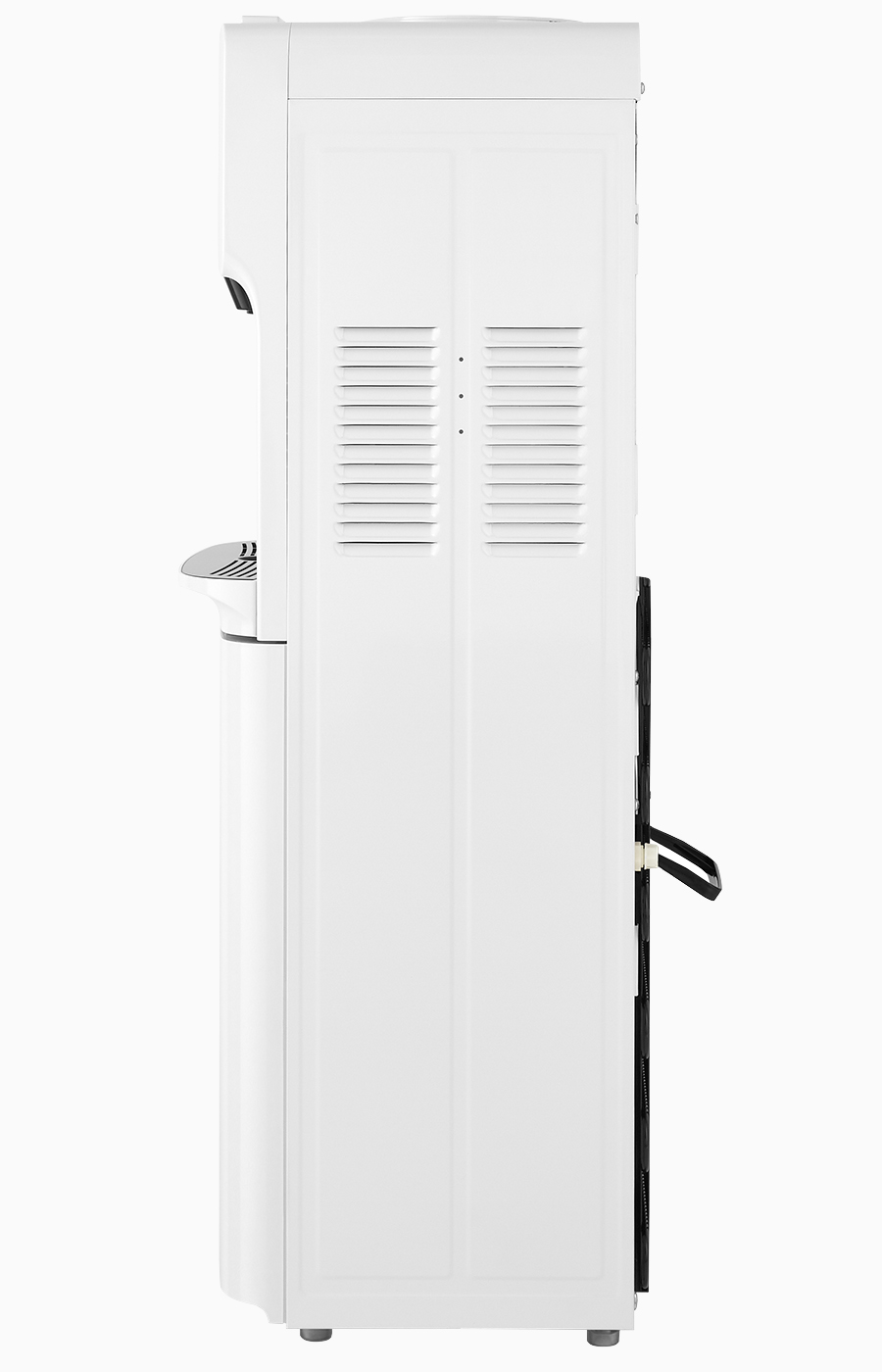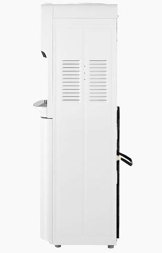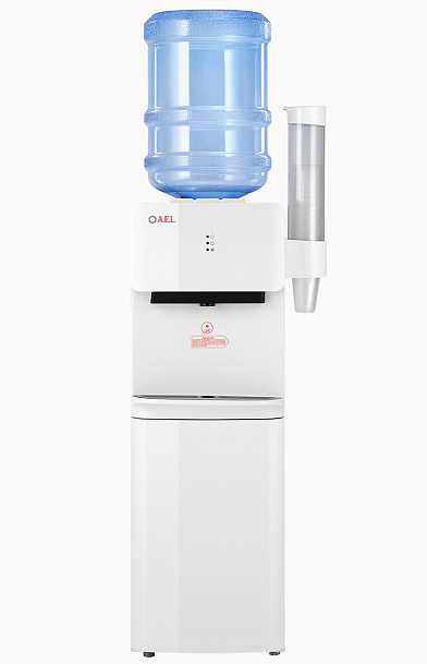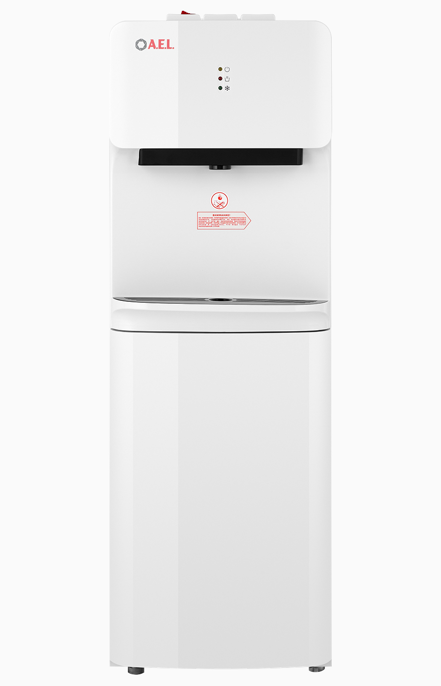 Новинка в ассортименте АЕЛ - напольный кулер с верхней загрузкой бутыли с компрессорным охлаждением яркого белого цвета с черными вставками. Высота кулера 930мм позволяет комфортно нажимать на три клавиши, одна из которых - горячей воды имеет защиту от случайного нажатия.