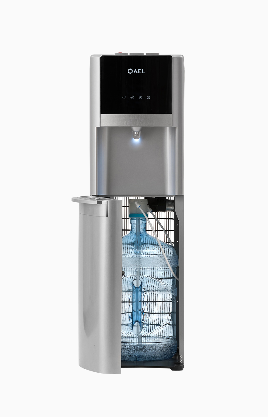 Кулер будет отлично смотреться в интерьере благодаря стильному дизайну, подсветке и нижней загрузке бутыли, закрывающейся дверцей. Снабжен 3-мя кнопками для воды холодной, горячей и комнатной температуры. Такое решение помогает экономить электроэнергию.В процессе эксплуатации аппарата в тот момент, когда вода в бутыли закончилась, на панели индикации загорится индикатор наличия воды в бутыли. Это символизирует о том, что необходимо заменить пустую бутыль.