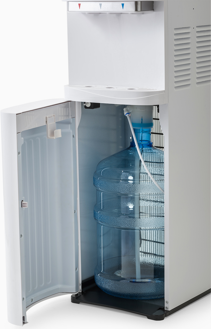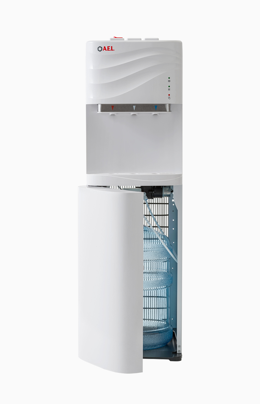 Новый кулер с нижней загрузкой бутыли белого цвета. После снятия крышки с бутыли Вам не надо поднимать её наверх. Просто установите трубку забора воды на бутыль и задвиньте внутрь шкафчика кулера. Оригинальный дизайн кулера с волной на лицевой панели выделяет этот кулер из всех аналогичных по техническим характеристикам. Снабжен 3-мя краниками-клавишами (горячая/прохладная/холодная).В процессе эксплуатации аппарата в тот момент, когда вода в бутыли закончилась, на панели индикации загорится индикатор наличия воды в бутыли. Это символизирует о том, что необходимо заменить пустую бутыль.