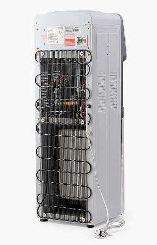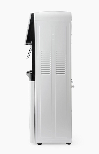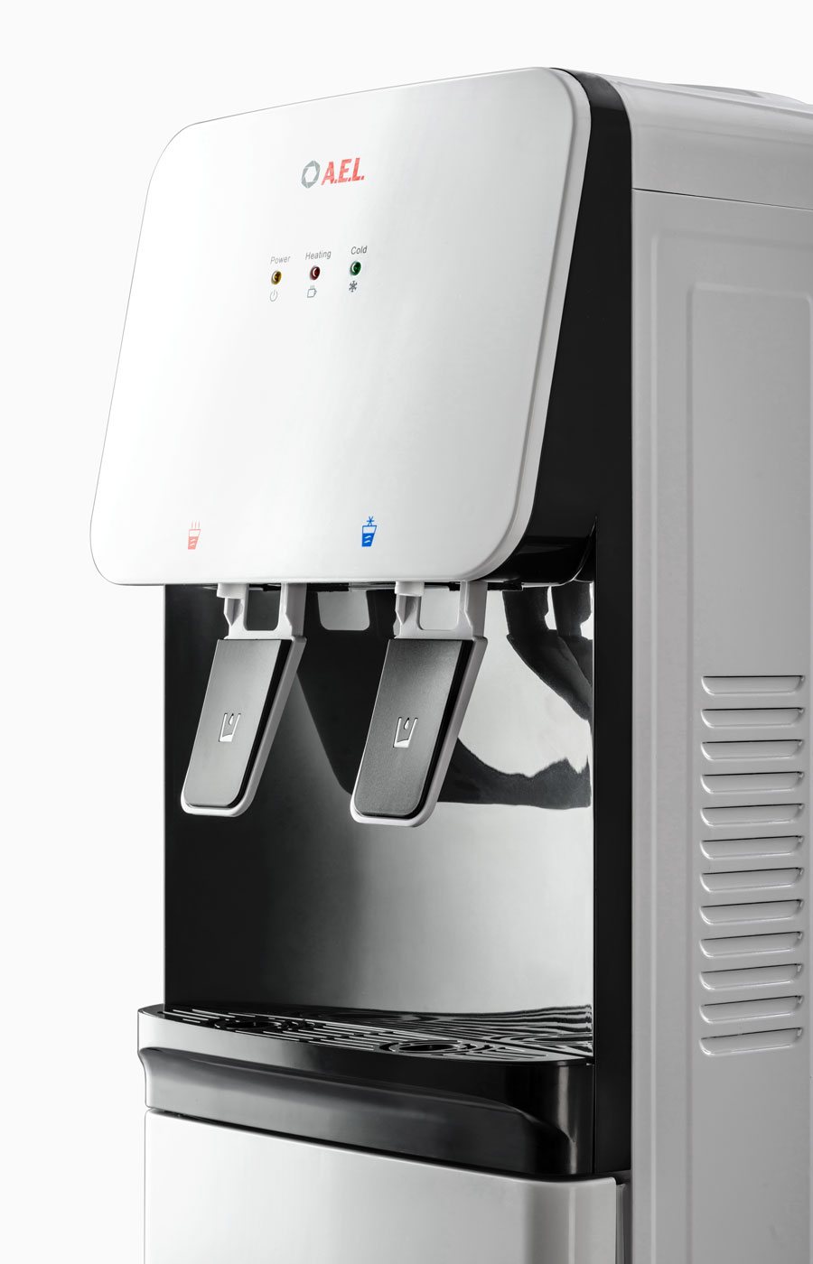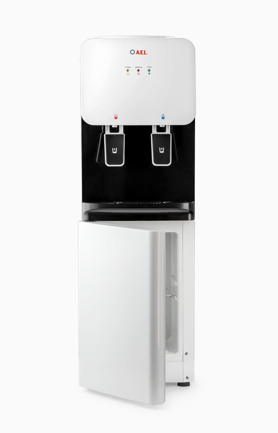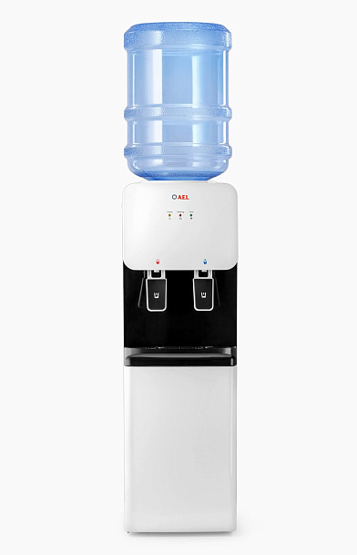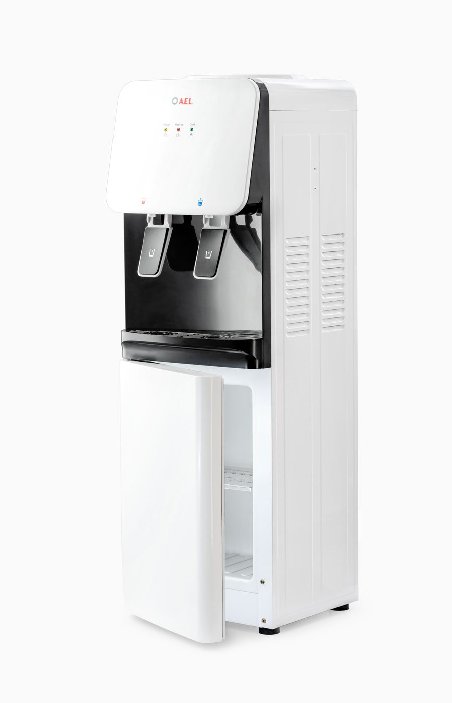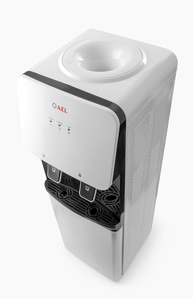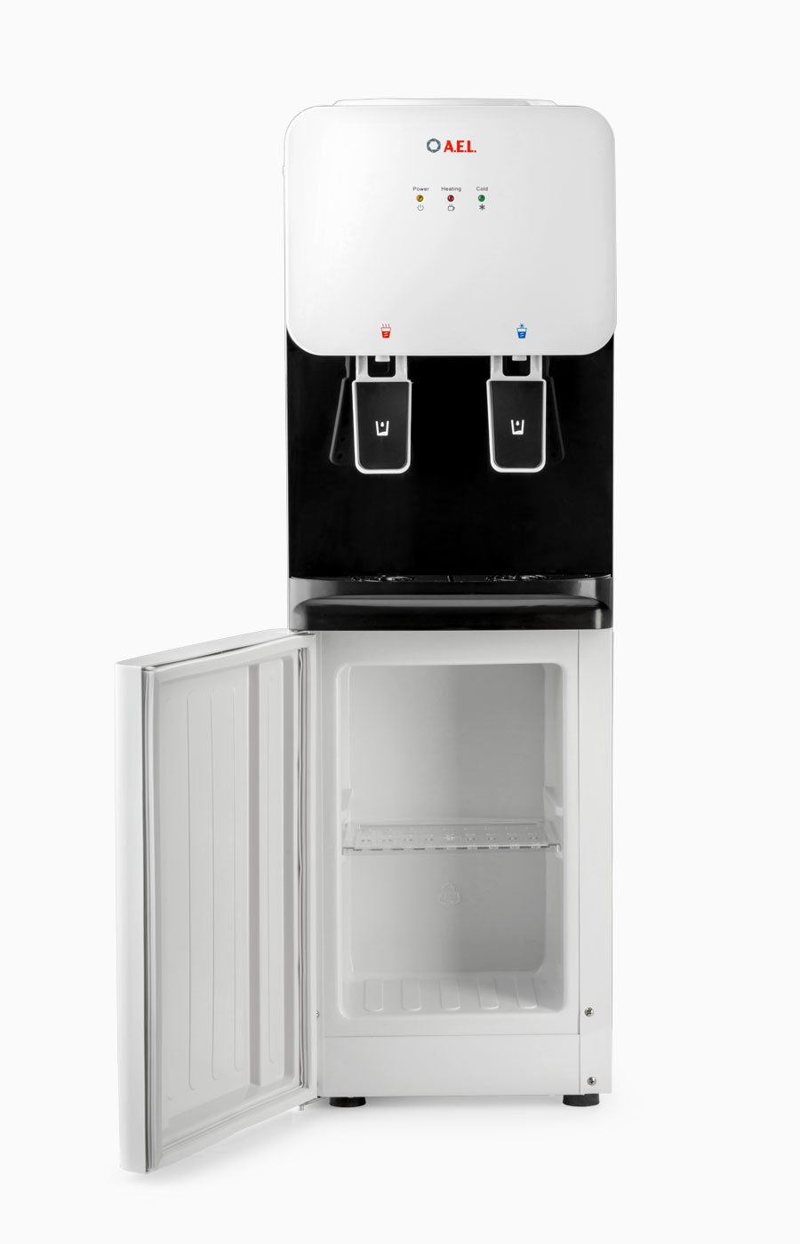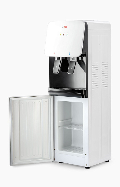 Напольный кулер с компрессорным охлаждением, нагревом и шкафчиком для продуктов. Гладкая лицевая панель, удобные краны "нажим чашкой" и малые габариты этого аппарата эргономично впишутся в Ваш офис.