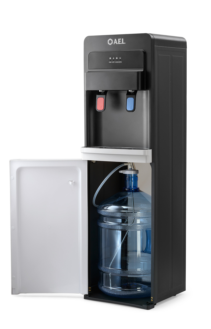 Новинка в ассортименте АЕЛ - кулер с нижней загрузкой бутыли с электронным охлаждением. Цвет: черный с белой вставкой. Модель оснащена двумя краниками нажим кружкой (горячая/холодная). Стильный лаконичный дизайн отлично будет смотреться в офисе и дома. В процессе эксплуатации аппарата в тот момент, когда вода в бутыли закончилась, на панели индикации загорится индикатор наличия воды в бутыли. Это символизирует о том, что необходимо заменить пустую бутыль.
