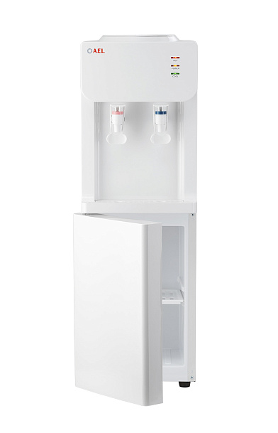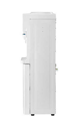 Напольный кулер с электронным охлаждением, нагревом и шкафчиком для продуктов. Удобные краны "нажим чашкой"с внутренней резьбой, малые габариты, высота 83см. Цвет: белый.