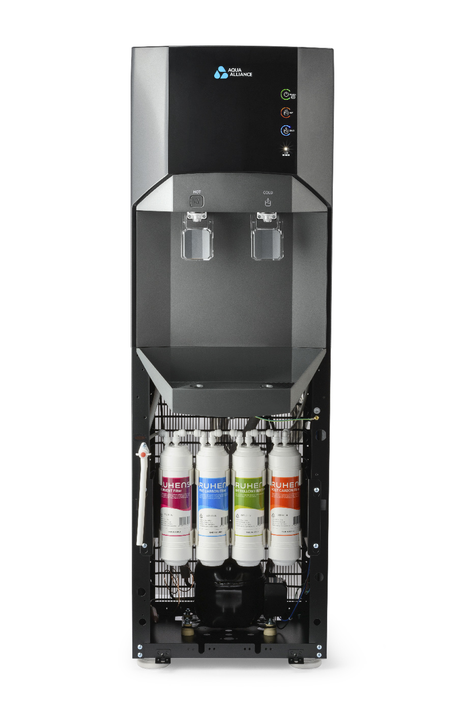Большой каплесборник– 2 л.Наличие защиты от ожогов (на панели управления горячего крана имеется кнопка, которая блокирует горячую воду). Защитные носики предотвращают рост бактерий.Большое пространство в зоне подачи воды – 26 см.Функция энергосбережения.Эргономичный дизайн. Черный цвет. Система UV обеззараживания дезинфицирует фильтрованную воду. Мощность UV системы 2,0 mW, напряжение 12 V. Фильтры 10"U.