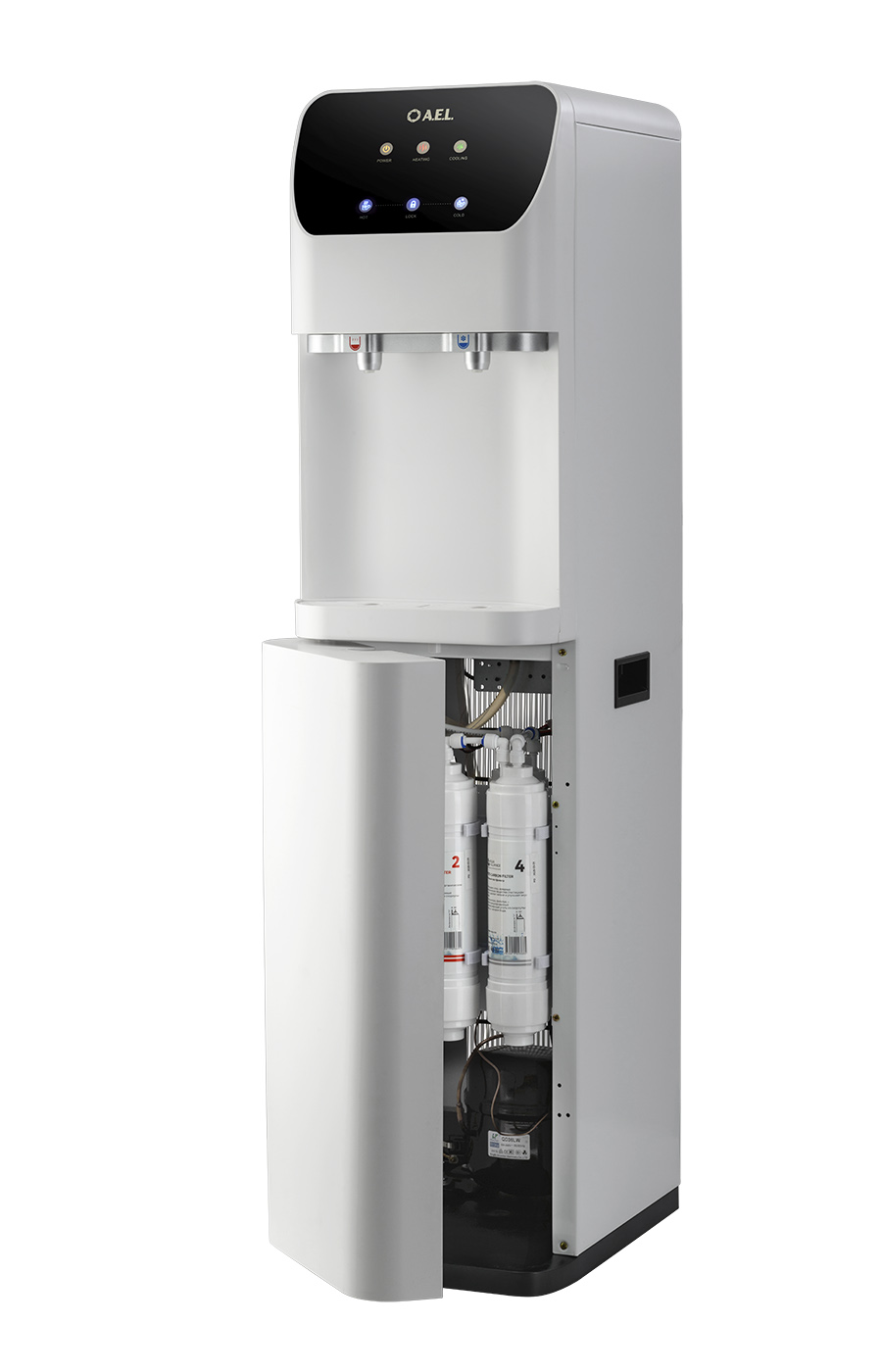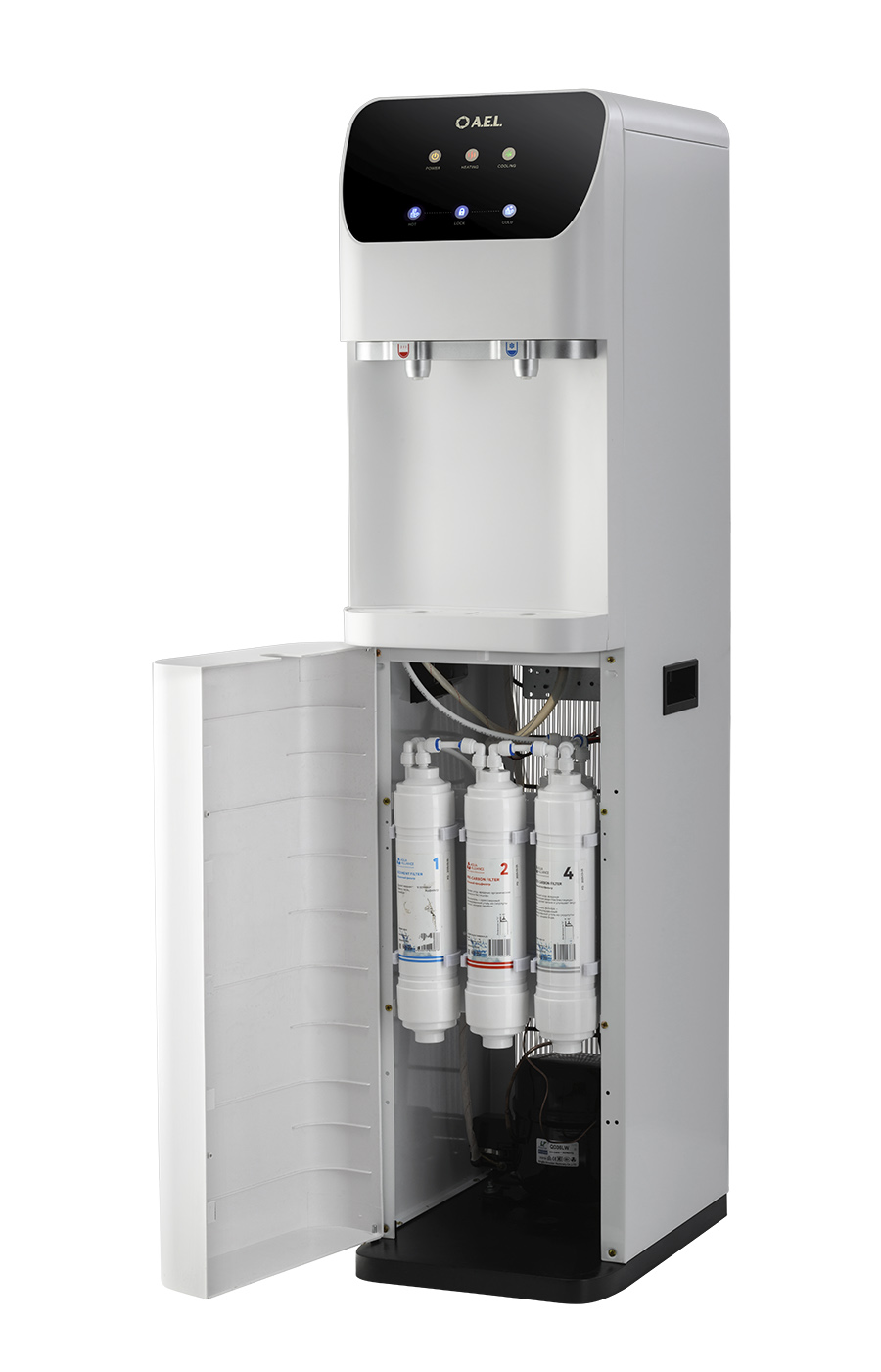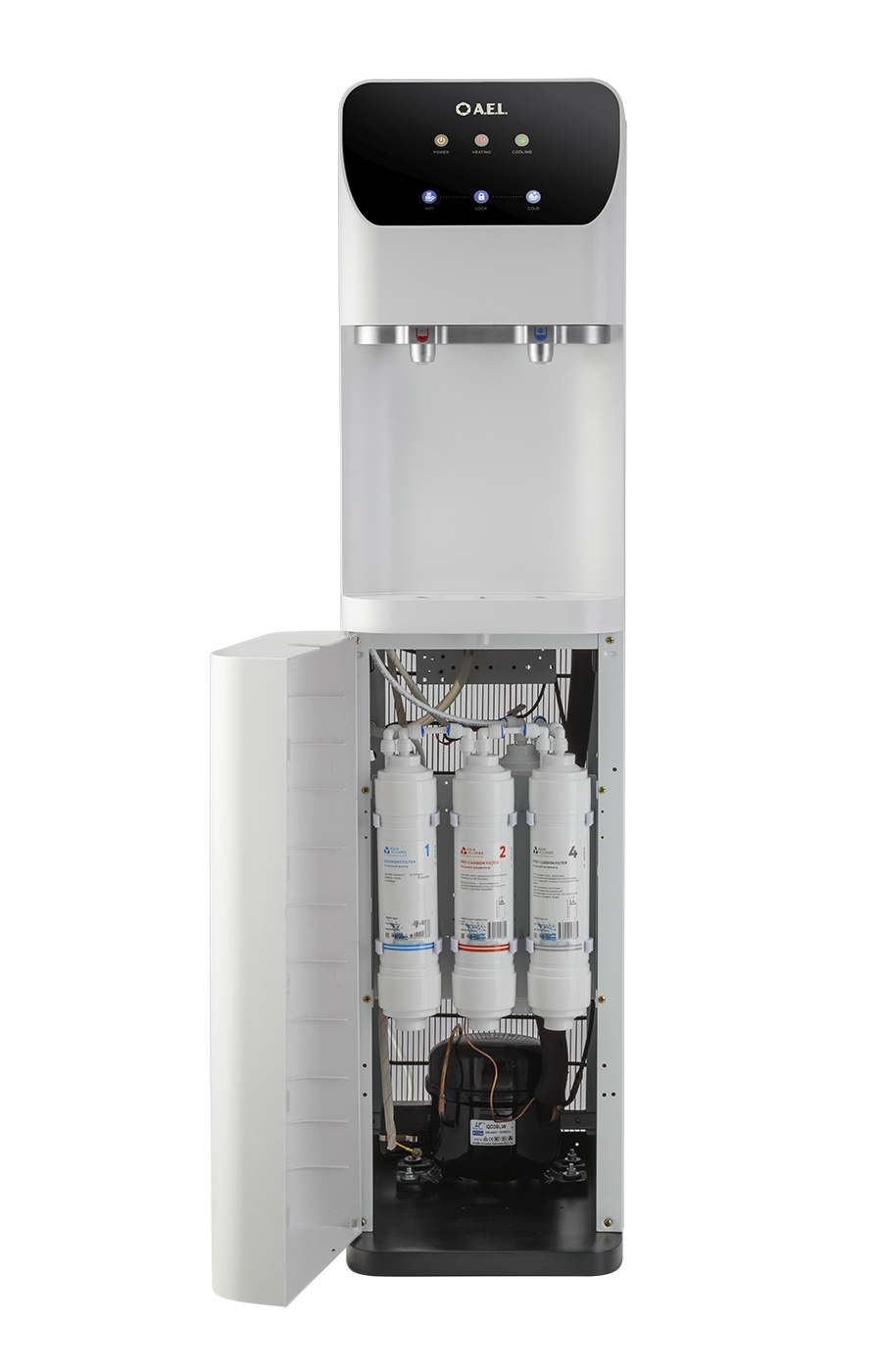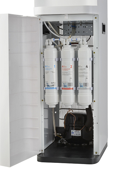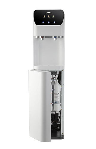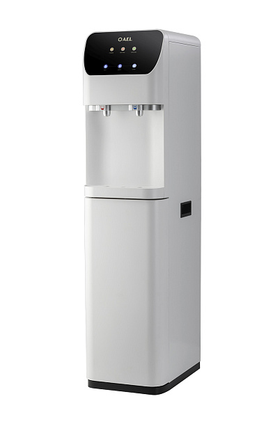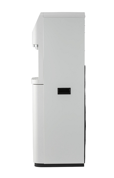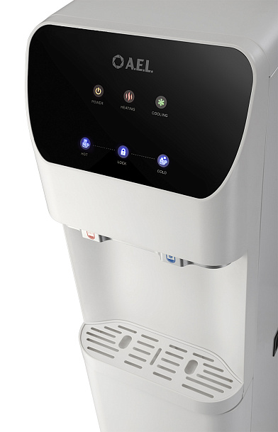 Пурифайер напольного типа с UF фильтрацией с компрессорным охлаждением. Вместительные баки холодной (8 л) и горячей воды (4,0 л). Большая производительность по нагреву: 8 л/ч (>85°С). Мощность нагревательного элемента 800 Вт. Сенсорная панель управления с блокировкой. Подача воды осуществляется нажатием на сенсорную панель, или порционно (можно налить 1 стакан воды при однократном касании). Съемные носики кранов подачи воды. Индикация работы пурифайера, нагрева и охлаждения воды. Корпус белого цвета. Производство: Китай. Комплектация: фильтры 12U UF, трубка 1/4 - 3 м, кран-врезки.