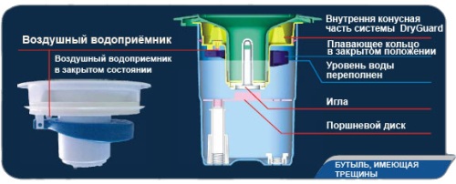 Инжекционная литая прокладка создает герметичную среду внутри водяного резервуара. В случае механического повреждения бутыли (бутыль с трещиной), система перекрывает воздушный клапан, тем самым предотвращая утечку воды из бутыли.